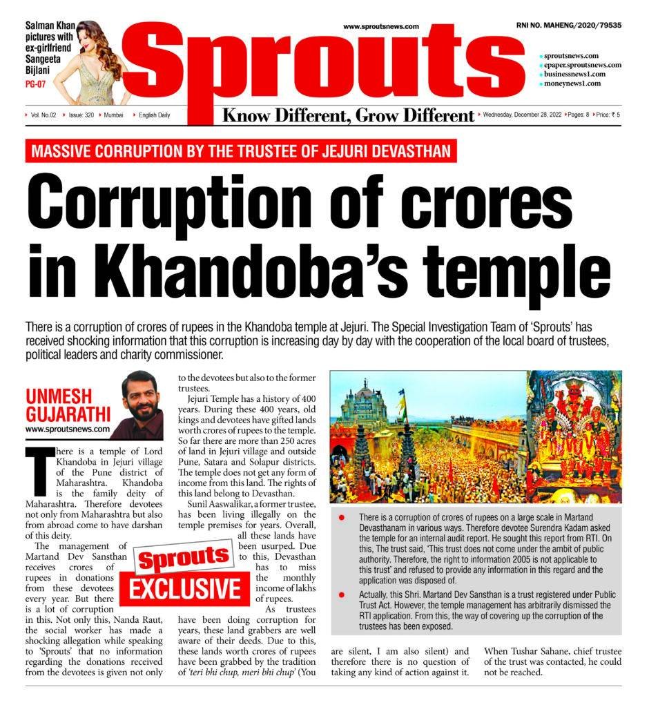 जेजुरीच्या खंडोबा मंदिरात कोट्यवधी रुपयांचा भ्रष्टाचार होत आहे. स्थानिक विश्वस्त मंडळ, राजकीय पुढारी व धर्मादाय आयुक्त यांच्या सहकार्यातून हा भ्रष्टाचार दिवसेंदिवस अधिकच वाढत आहे, अशी धक्कादायक माहिती ‘स्प्राऊट्स’च्या इन्व्हेस्टीगेशन टीमला मिळालेली आहे.