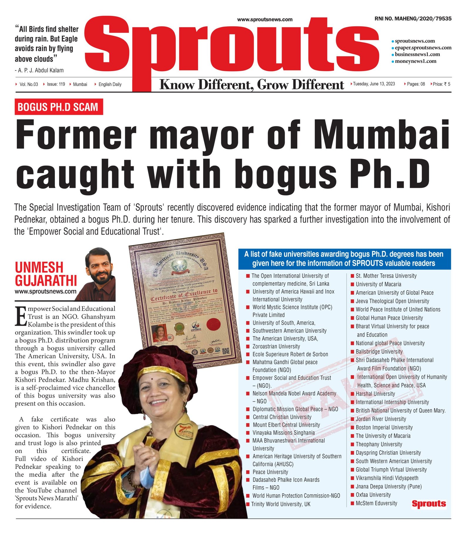 मुंबईच्या महापौर या मुंबईच्या प्रथम नागरिक असतात. हा मान फार मोठा असतो. हा मान यापूर्वी किशोरी पेडणेकर यांना होता. त्या याअगोदर मुंबईच्या महापौर होत्या. मात्र त्यांनी त्यांच्या महापौर पदाच्या काळात चक्क बोगस पीएचडी घेतलेली होती, असे ‘स्प्राऊट्स’च्या स्पेशल इन्व्हेस्टीगेशन टीमला हाती आलेल्या पुराव्यातून आढळून आलेले आहे.