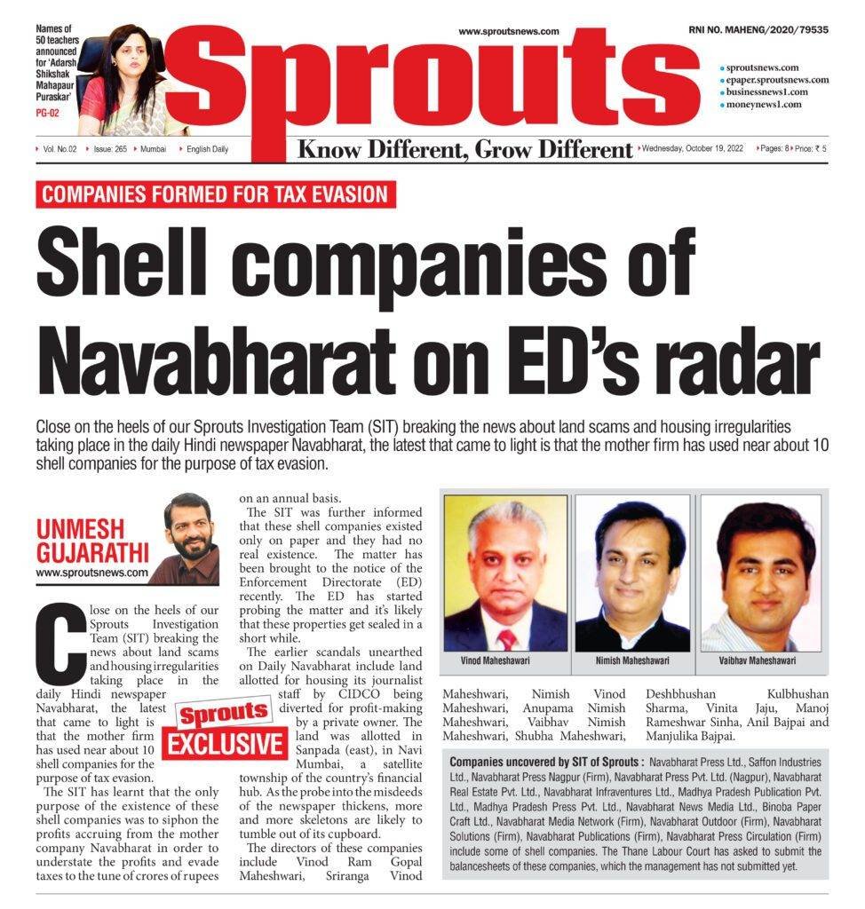 हिंदी दैनिक ‘नवभारत’ के मैनेजमेंट और मालिकों का हर दिन कोई न कोई घोटाला या फ्रॉड सामने आ रहा है. पहले सर्कुलेशन घोटाला, फिर कर्मचारियों के घर के लिए सानपाड़ा (पूर्व) में सिडको द्वारा आबंटित जमीन घोटाला के बाद ‘नवभारत’ के डायरेक्टर रहे डी.बी. शर्मा द्वारा पत्रकार कोटे का पवई में म्हाडा द्वारा निर्मित इमारत में फ्लैट हथियाने का मामला उजागर हो चुका है. इसके बाद अब ‘नवभारत’ के मालिकों और मैनेजमेंट द्वारा शेल कंपनियों के जरिए हर वर्ष करोड़ों रुपए की कर चोरी का मामला सामने आया है. इस मामले के पूरे कागजात स्प्राउट्स की स्पेशल इन्वेस्टिगेशन टीम के हाथ लगे हैं.