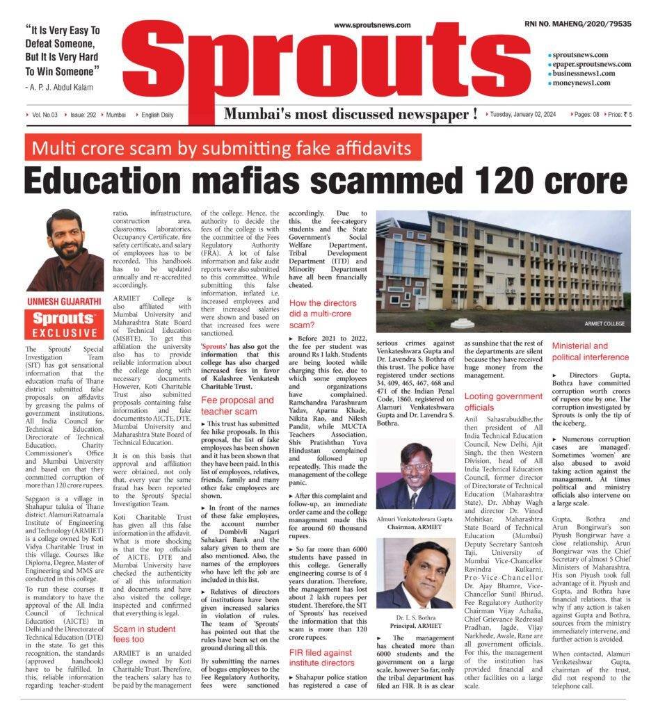 The Sprouts’ Special Investigation Team (SIT) has got sensational information that the education mafia of Thane district submitted false proposals on affidavits by greasing the palms of government institutions, All India Council for Technical Education, Directorate of Technical Education, Charity Commissioner’s Office and Mumbai University and based on that they committed corruption of more than 120 crore rupees.