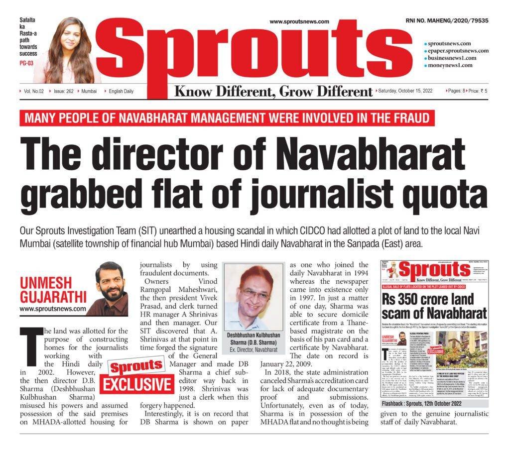 वर्ष 2002 में सिडको द्वारा सानपाड़ा (पूर्व) में कर्मचारियों के लिए घर की शर्त पर हिंदी दैनिक नवभारत को जमीन अलॉट की गई थी. कर्मचारियों को नवभारत प्रबंधन ने घर बनाकर नहीं दिया, उल्टे तत्कालीन डायरेक्टर देशभूषण कुलभूषण शर्मा (डी.बी. शर्मा) ने म्हाडा के पत्रकार कोटे का पवई में निर्मित फ्लैट फर्जीवाड़ा कर हथिया लिया. इस फर्जीवाड़े में मालिक विनोद रामगोपाल माहेश्वरी, तत्कालीन प्रेसीडेंट विवेक प्रसाद, क्लर्क से एचआर मैनेजर बने अच्छाला श्रीनिवास (ए. श्रीनिवास राव) व तत्कालीन मैनेजर प्रकाश वाल्वे की भूमिका रही. यह सनसनीखेज जानकारी स्प्राउट्स की स्पेशल इन्वेस्टिगेशन टीम की जांच-पड़ताल में सामने आई है.
