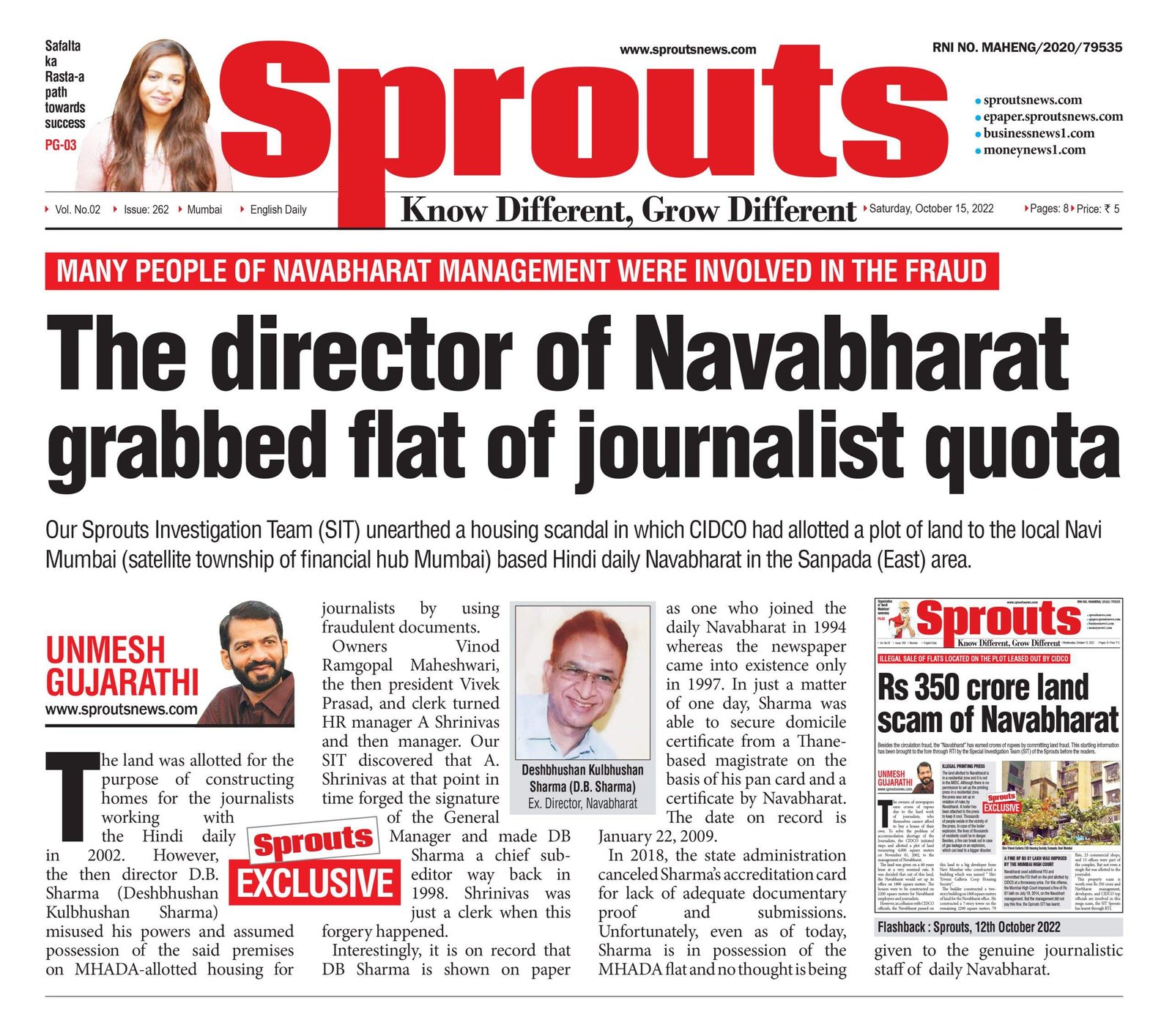 वर्ष 2002 में सिडको द्वारा सानपाड़ा (पूर्व) में कर्मचारियों के लिए घर की शर्त पर हिंदी दैनिक नवभारत को जमीन अलॉट की गई थी. कर्मचारियों को नवभारत प्रबंधन ने घर बनाकर नहीं दिया, उल्टे तत्कालीन डायरेक्टर देशभूषण कुलभूषण शर्मा (डी.बी. शर्मा) ने म्हाडा के पत्रकार कोटे का पवई में निर्मित फ्लैट फर्जीवाड़ा कर हथिया लिया. इस फर्जीवाड़े में मालिक विनोद रामगोपाल माहेश्वरी, तत्कालीन प्रेसीडेंट विवेक प्रसाद, क्लर्क से एचआर मैनेजर बने अच्छाला श्रीनिवास (ए. श्रीनिवास राव) व तत्कालीन मैनेजर प्रकाश वाल्वे की भूमिका रही. यह सनसनीखेज जानकारी स्प्राउट्स की स्पेशल इन्वेस्टिगेशन टीम की जांच-पड़ताल में सामने आई है.