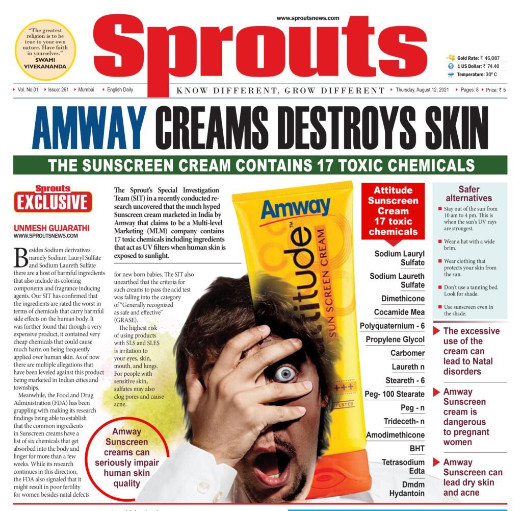 स्प्राउट्स (Sprouts) की स्पेशल इन्वेस्टिगेशन टीम (SIT) ने हाल ही में किए गए एक शोध में खुलासा किया कि मल्टी लेवल मार्केटिंग (Multi-Level Marketing (MLM) कंपनी होने का दावा करने वाली एमवे (Amway) द्वारा भारत में बेची जाने वाली बहुप्रचारित सनस्क्रीन क्रीम (sunscreen cream) में अवयवों (ingredients) सहित 17 जहरीले रसायन होते हैं जो मानव त्वचा के सूर्य के प्रकाश के संपर्क में होने पर यूवी फिल्टर्स (UV filters) के रूप में कार्य करते हैं.