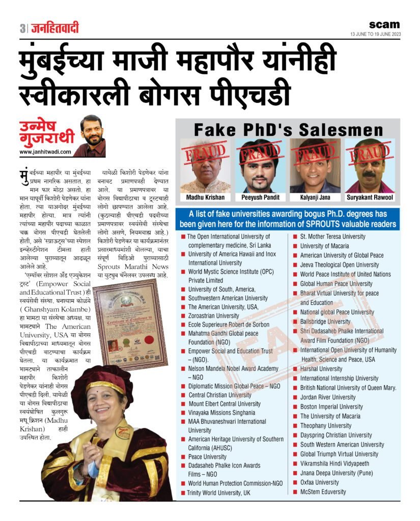 ‘एम्पॉवर सोशल अँड एज्युकेशन ट्रस्ट’ (Empower Social and Educational Trust ) ही स्वयंसेवी संस्था. घनश्याम कोळंबे ( Ghanshyam Kolambe) हा भामटा या संस्थेचा अध्यक्ष. या भामट्याने The American University, USA या बोगस विद्यापीठाच्या माध्यमातून बोगस पीएचडी वाटण्याचा कार्यक्रम घेतला. या कार्यक्रमात या भामट्याने तत्कालीन महापौर किशोरी पेडणेकर यांनाही बोगस पीएचडी दिली. यावेळी या बोगस विद्यापीठाचा स्वयंघोषित कुलगुरू मधू क्रिशन (Madhu Krishan) हाही उपस्थित होता.