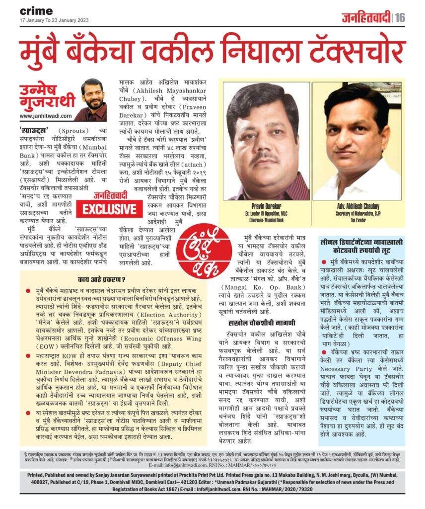 Mumbai Bank had recently sent a legal notice to the editor of ‘Sprouts’ through Adv. Akhilesh Mayashankar Chaubey. Chaubey is considered to be close to Pravin Darekar whose corrupt activities are well known.
