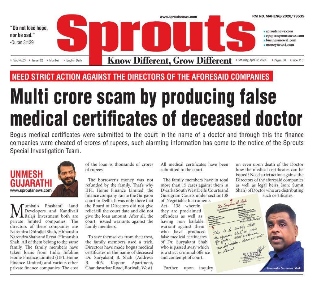 या आरोपी कुटुंबीयांनी आतापर्यंत बऱ्याच ठिकाणी या मयत डॉक्टरच्या नावाने बोगस वैद्यकीय प्रमाणपत्रे सादर केलेली आहेत. हा न्यायालयाचा अवमान आहे व फौजदारी गुन्हाही आहे. त्यामुळे या कंपन्यांच्या संचालक कुटुंबीय व मयत डॉक्टरच्या वारसांवर ( मुलगा: सुमित शाह ) त्वरित कारवाई करण्यात यावी, अशी मागणी ‘स्प्राऊट्स’च्या स्पेशल इन्वेस्टीगेशन टीमने केलेली आहे.