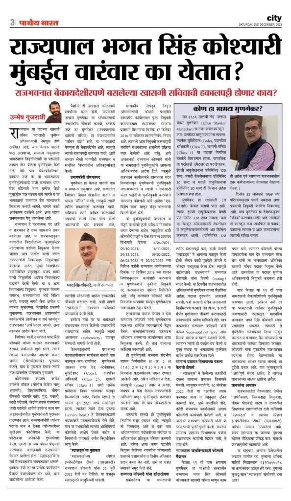 Munagekar, who is only 12th pass, was earlier working as a private secretary to the then Governor Bhagat Singh Koshyari. Following Koshyari’s recommendation, the present Governor Ramesh Bais re-appointed the rogue as Additional Private Secretary. Actually, a suitable officer should have been appointed to this post. Not only this 12th pass rogue was illegally reappointed, but Governor Bhagat Singh Koshyari himself is trying to re-appoint this rogue repeatedly. For that, he comes to Raj Bhavan frequently and recommends this rogue to Governor Bais. It is unfortunate that Koshyari has to rely on this bogus person to maintain his hold on the Raj Bhavan Mumbai. Smart readers must have noticed that there are ‘financial’ relationships behind this.