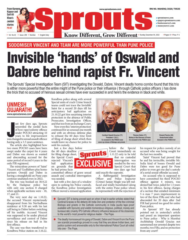 The Sprouts’ Special Investigation Team (SIT) investigating the Oswald, Dabre, Vincent deadly homo combo found that this trio is either more powerful than the entire might of the Pune police or their influence ( through Catholic police officers ) has done the trick that no accused of heinous sexual crimes have ever succeeded in and here’s the evidence in black and white.