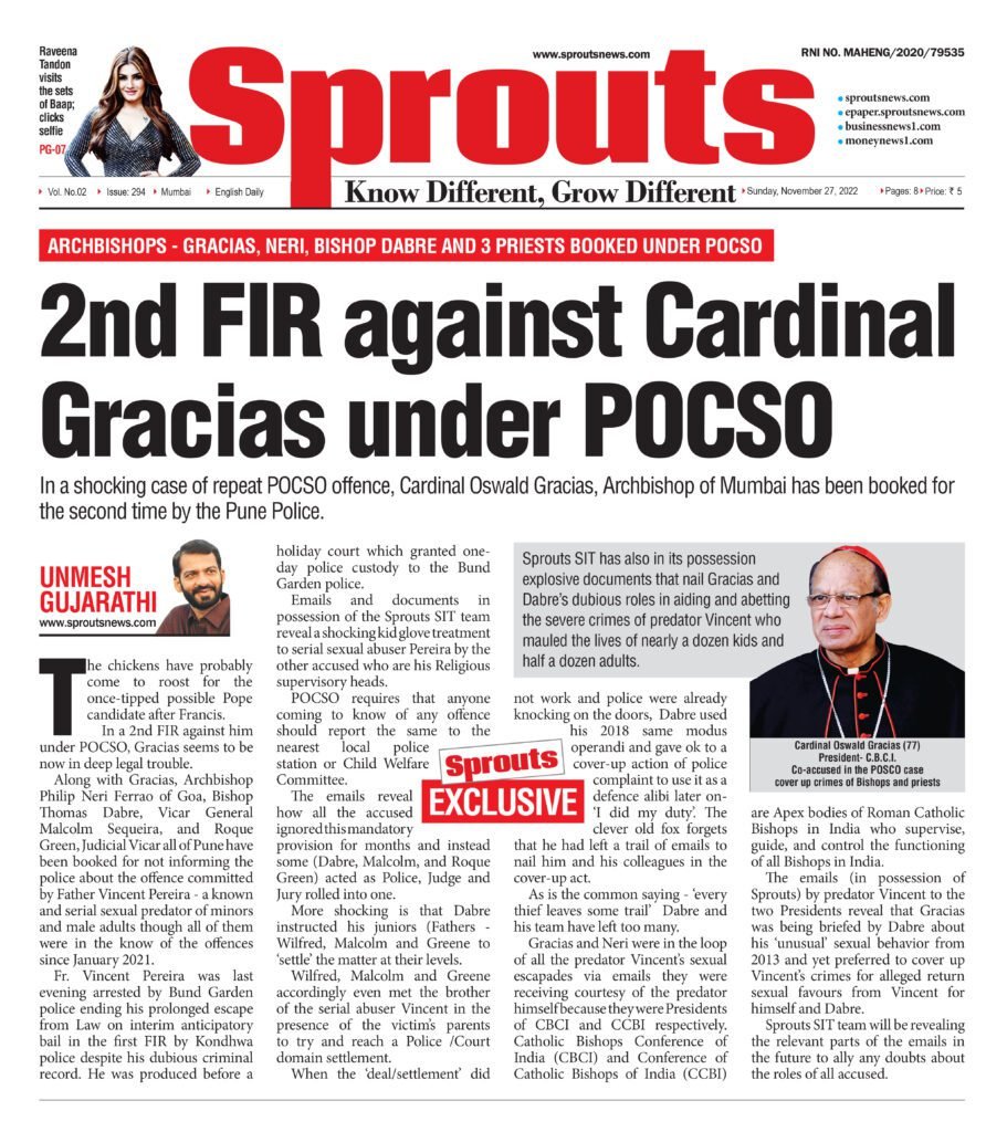 Sprouts SIT has also in its possession explosive documents that nail Gracias and Dabre’s dubious roles in aiding and abetting the severe crimes of predator Vincent who mauled the lives of nearly a dozen kids and half a dozen adults.