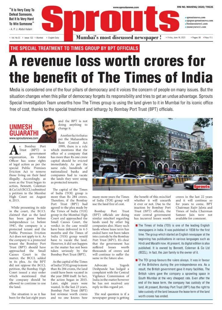 मुंबई पोर्ट ट्रस्टच्या (बीपीटी ) बड्या अधिकाऱ्यांनी आर्थिक हेतूने हलगर्जीपणा केला आहे. आणि त्यामुळेच टाइम्स ऑफ इंडिया वृत्तसमूह आजही या बीपीटीच्याच जागेत ठाण मांडून बसलेला आहे, त्यामुळे केंद्र सरकारचा मागील वर्षांत कोट्यवधी रुपयांचा महसूल बुडालेला आहे, अशी खळबळजनक माहिती ‘स्प्राऊट्स’च्या स्पेशल इन्व्हेस्टीगेशन टीमला मिळालेली आहे.