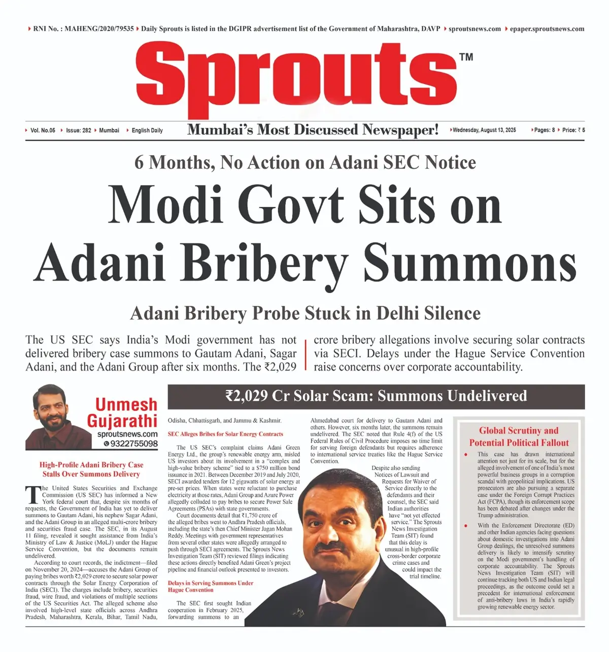 With the Enforcement Directorate (ED) and other Indian agencies facing questions about domestic investigations into Adani Group dealings, the unresolved summons delivery is likely to intensify scrutiny on the Modi government’s handling of corporate accountability. The Sprouts News Investigation Team (SIT) will continue tracking both US and Indian legal proceedings, as the outcome could set a precedent for international enforcement of anti-bribery laws in India’s rapidly growing renewable energy sector.
