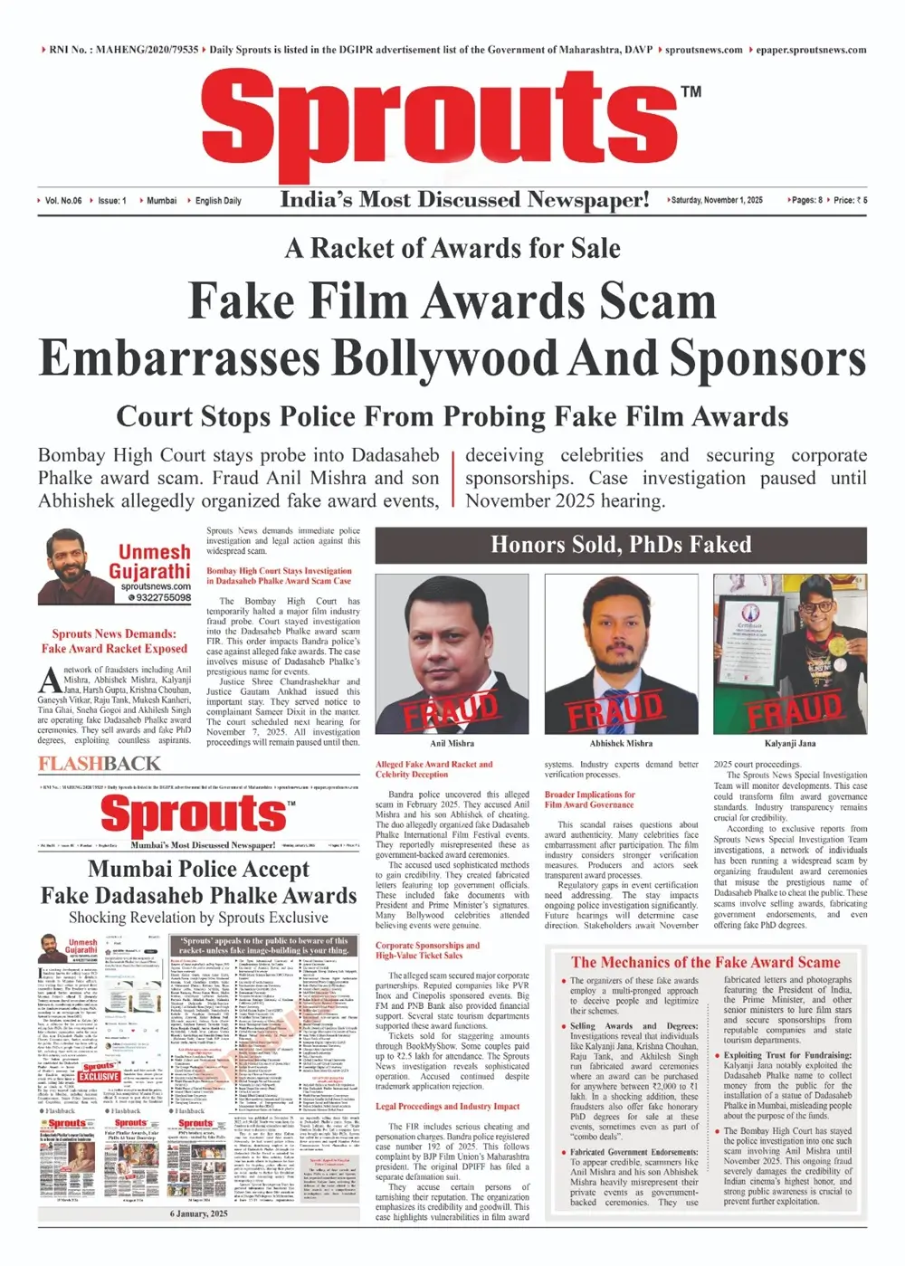 A network of fraudsters including Anil Mishra, Abhishek Mishra, Kalyanji Jana, Harsh Gupta, Krishna Chouhan, Ganeysh Vitkar, Raju Tank, Mukesh Kanheri, Tina Ghai, Sneha Gogoi and Akhilesh Singh are operating fake Dadasaheb Phalke award ceremonies. They sell awards and fake PhD degrees, exploiting countless aspirants. Sprouts News demands immediate police investigation and legal action against this widespread scam.