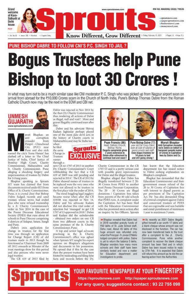 Bhapkar alleged that Dabre has illegally transferred between ₹ 20-30 Crores from PDES to another trust Poona Diocesan Corporation. The 20 – 30 Crores are illegal donations / Capitation fees taken from parents of the 40 odd schools that PDES runs. A complaint under the Capitation Act has been filed with the Education Commissioner who has promised stern action after an inquiry by his Officers. Sprouts has learnt that the Education department too has issued notice to Dabre seeking explanation on Bhapkar’s complaint.