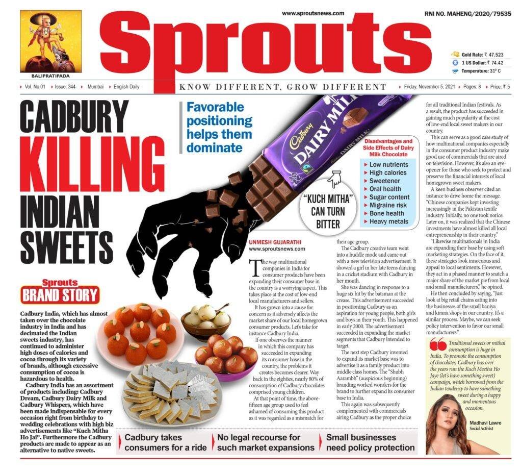 कैडबरी इंडिया (Cadbury India), जिसने भारत में चॉकलेट उद्योग पर लगभग कब्जा कर लिया है और भारतीय मिष्ठान उद्योग को नष्ट कर दिया है,