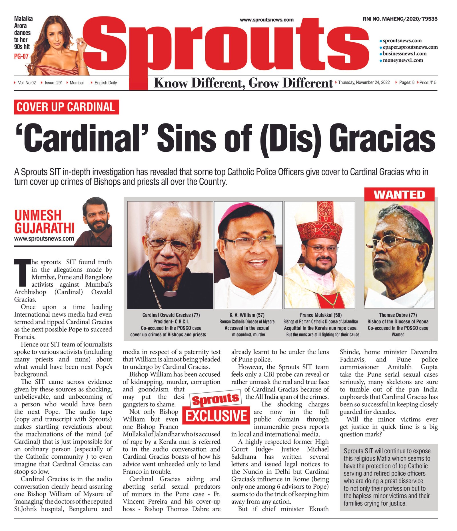A Sprouts SIT in-depth investigation has revealed that some top Catholic Police Officers give cover to Cardinal Gracias who in turn cover up crimes of Bishops and priests all over the Country.