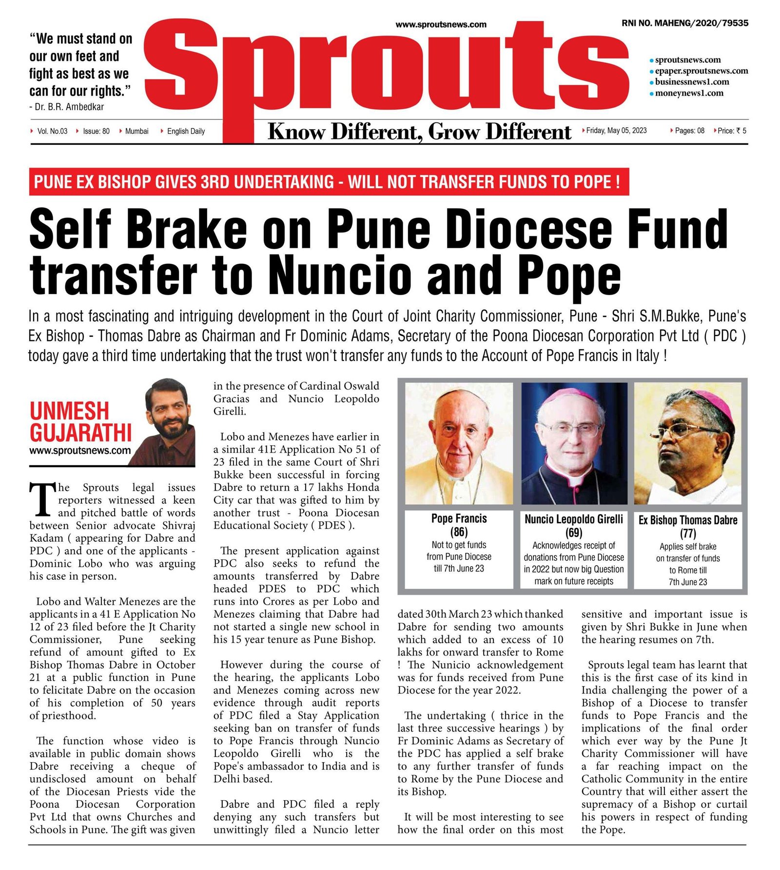 Self Brake on Pune Diocese Fund transfer to Nuncio and Pope