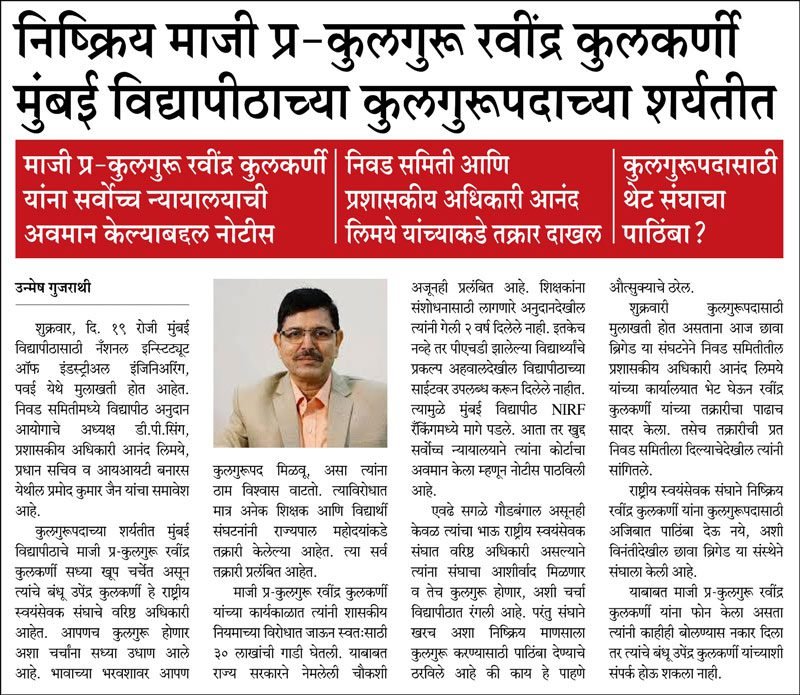 माजी प्र-कुलगुरू रवींद्र कुलकर्णी यांना सर्वोच्च न्यायालयाची अवमान केल्याबद्दल नोटीस निवड समिती…