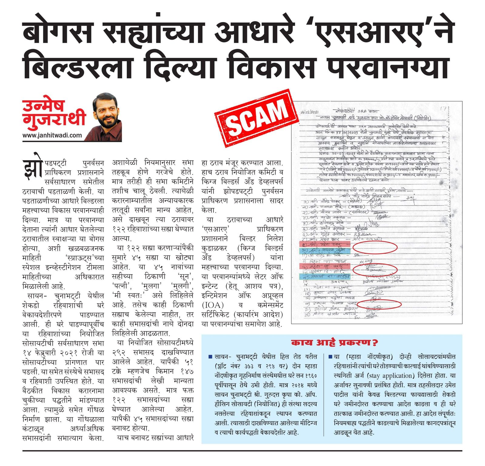 बोगस पदाधिकाऱ्यांच्या सह्या असलेल्या लेटरहेडच्या आधारे बिल्डरची ‘एसआरए’च्या प्रकल्पासाठी नियुक्ती