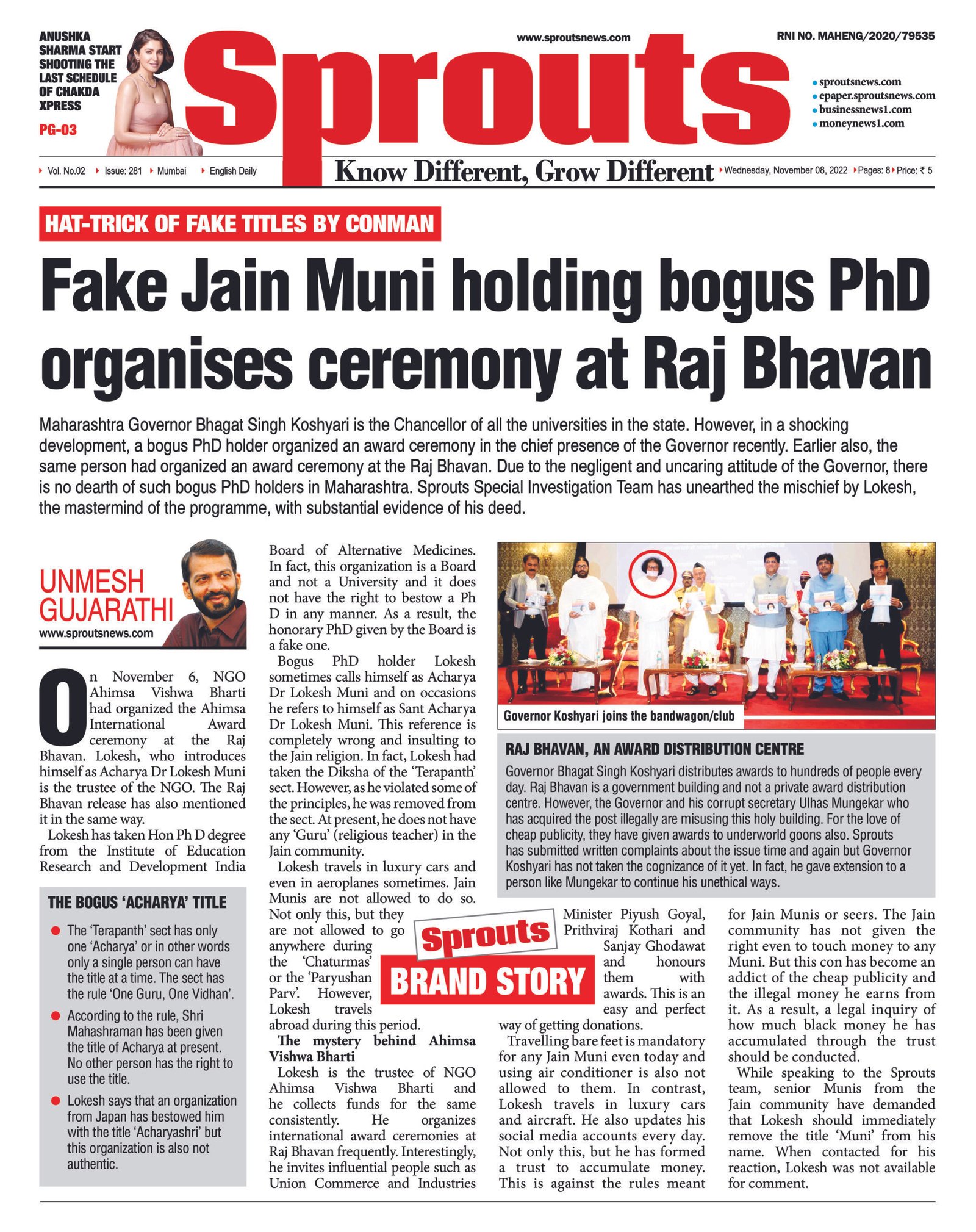 फर्जी पीएचडी धारक नकली जैन ‘मुनि’ ने राजभवन में किया पुरस्कार समारोह