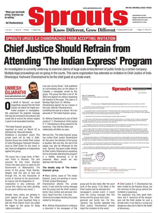 तर यावरून या कुटुंबाचे व या ग्रुपचे वैयक्तिक व कौटुंबिक घनिष्ठ संबंध आहेत, असा चुकीचा संदेश जावू शकतो. यासाठी सरन्यायाधीश चंद्रचूड यांनी या कार्यक्रमाचे आमंत्रण नाकारावे, असे आवाहन ‘स्प्राऊट्स’ने नम्रपणे केलेले आहे.