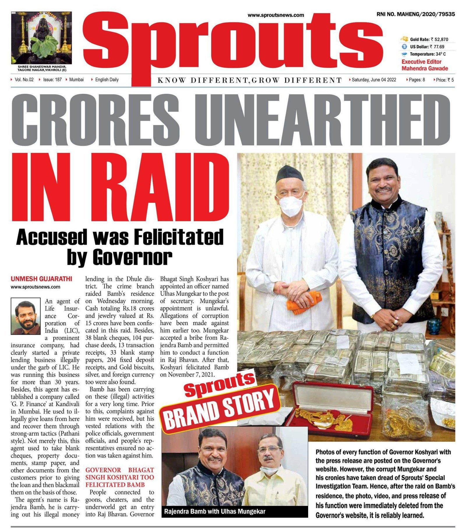 Photos of every function of Governor Koshyari with the press release are posted on the Governor’s website. However, the corrupt Mungegar and his cronies have taken dread of Sprouts’ Special Investigation Team. Hence, after the raid on Bamb’s residence, the photo, video, and press release of his function were immediately deleted from the Governor’s website, it is reliably learned.