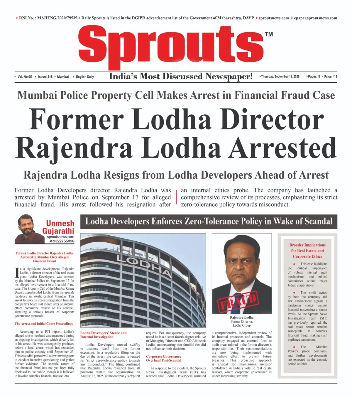 Former Lodha Developers director Rajendra Lodha was arrested by Mumbai Police on September 17 for alleged financial fraud. His arrest followed his resignation after an internal ethics probe. The company has launched a comprehensive review of its processes, emphasizing its strict zero-tolerance policy towards misconduct.
