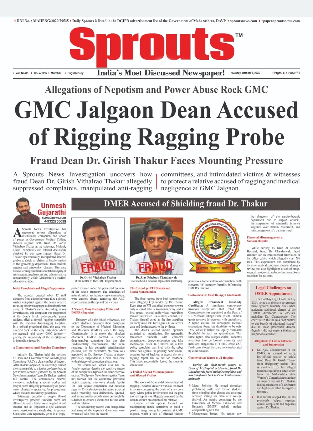 A Sprouts News Investigation has exposed how GMC Jalgaon Dean Dr. Girish Vitthalrao Thakur allegedly manipulated anti-ragging committees, suppressed complaints, and intimidated witnesses to shield a female relative from serious ragging and negligence allegations. The case raises pressing questions about nepotism, corruption, and the credibility of Maharashtra’s medical education oversight.