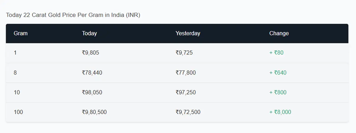 - Lucknow: Matches Delhi’s prices exactly – 24-carat at ₹11,552 per gram and 22-carat at ₹10,590 per gram