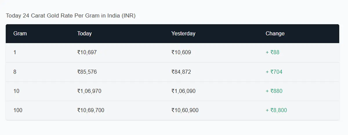 The price gap becomes more obvious with larger amounts. Ten grams of 24K gold will cost you ₹1,16,480.01. The same amount of 22K gold sells for ₹1,06,773.34. That’s almost a ₹10,000 difference, which shows how much more people pay for higher purity.