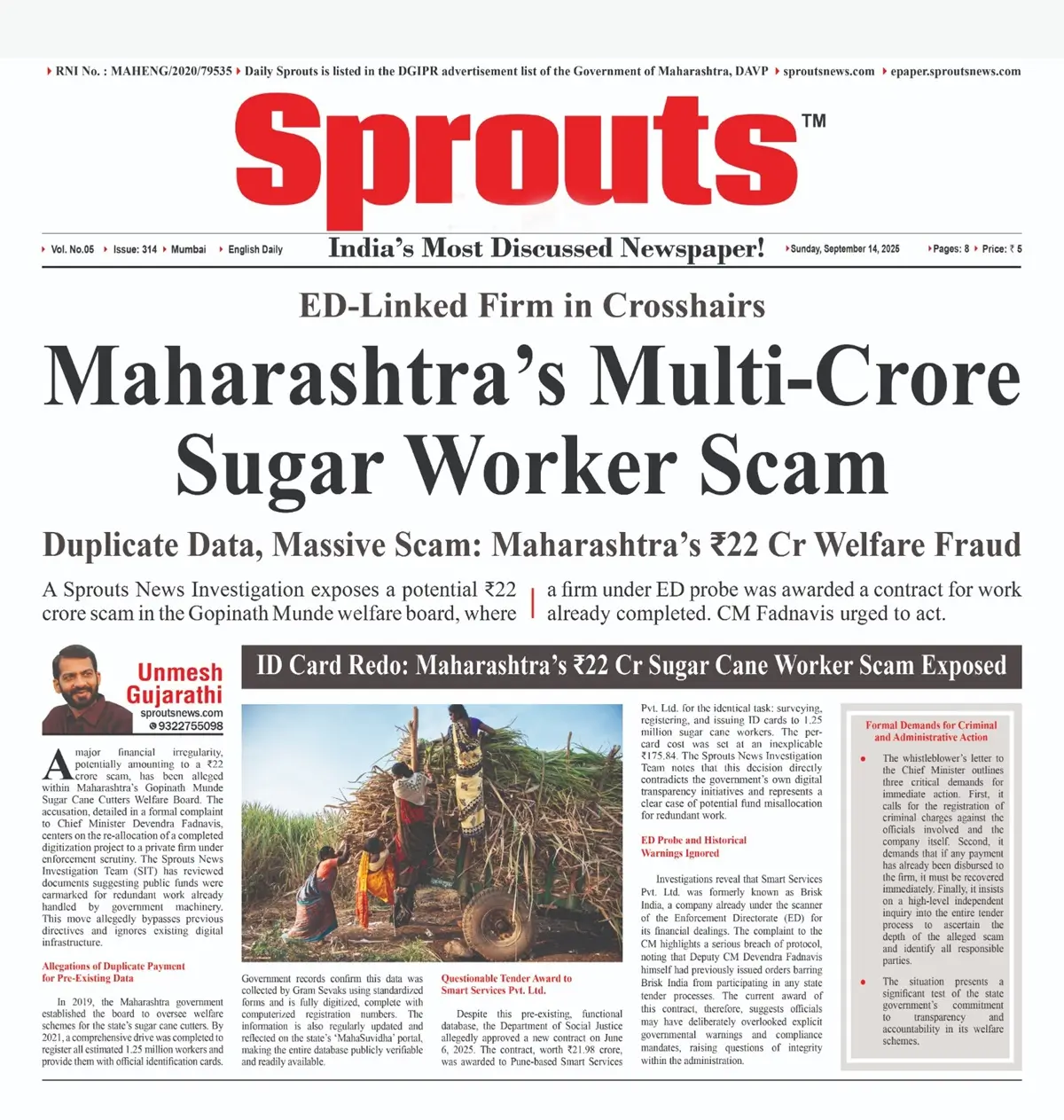A Sprouts News Investigation exposes a potential ₹22 crore scam in the Gopinath Munde welfare board, where a firm under ED probe was awarded a contract for work already completed. CM Fadnavis urged to act.