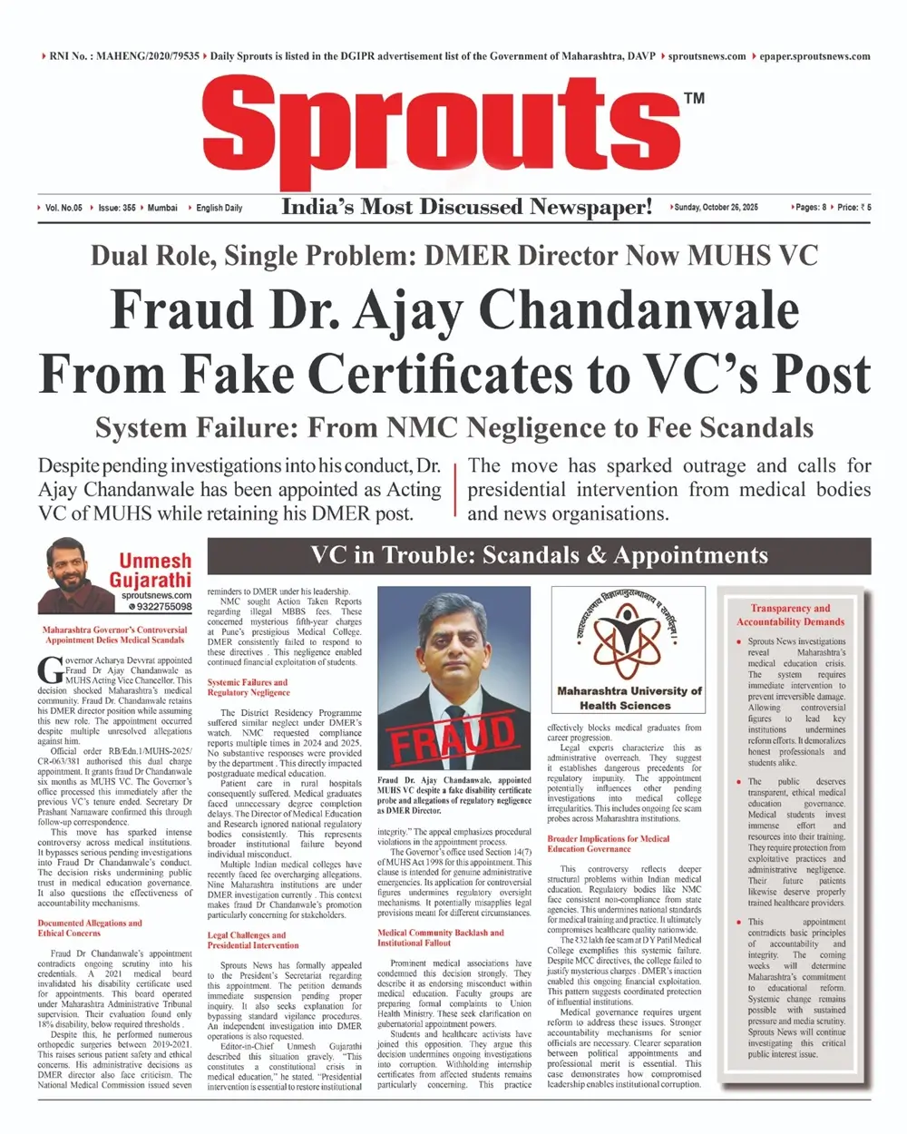 Sprouts News investigations reveal Maharashtra’s medical education crisis. The system requires immediate intervention to prevent irreversible damage. Allowing controversial figures to lead key institutions undermines reform efforts. It demoralizes honest professionals and students alike.