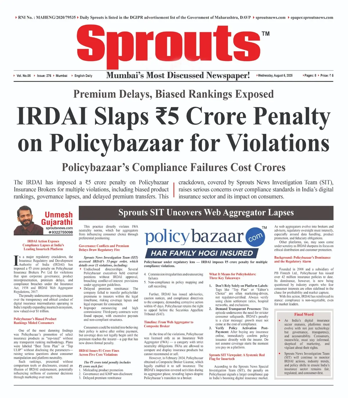 The IRDAI has imposed a ₹5 crore penalty on Policybazaar Insurance Brokers for multiple violations, including biased product rankings, governance lapses, and delayed premium transfers. This crackdown, covered by Sprouts News Investigation Team (SIT), raises serious concerns over compliance standards in India’s digital insurance sector and its impact on consumers.