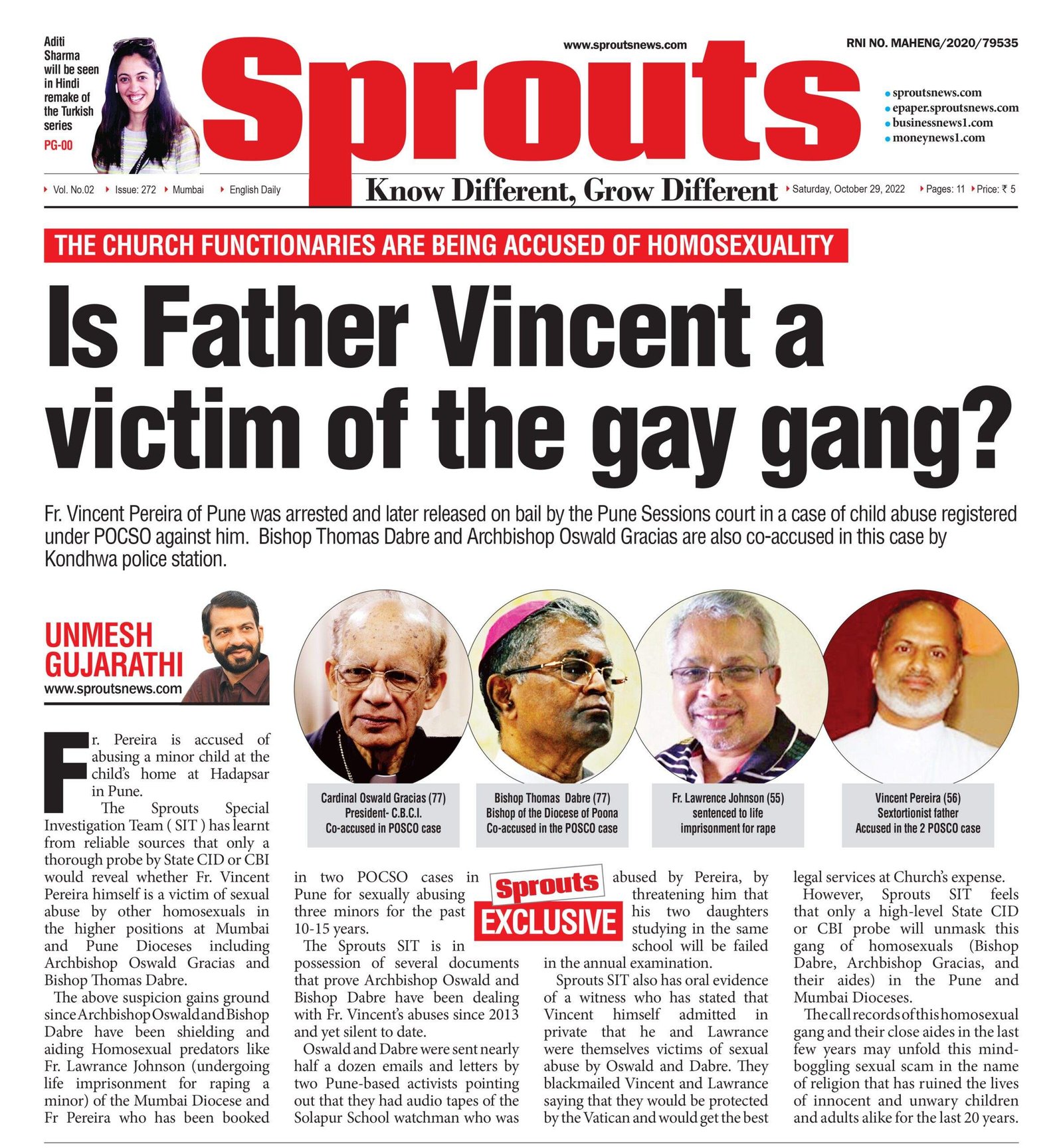 The Sprouts Special Investigation Team ( SIT ) has learnt from reliable sources that only a thorough probe by State CID or CBI would reveal whether Fr. Vincent Pereira himself is a victim of sexual abuse by other homosexuals in the higher positions at Mumbai and Pune Dioceses including Archbishop Oswald Gracias and Bishop Thomas Dabre.