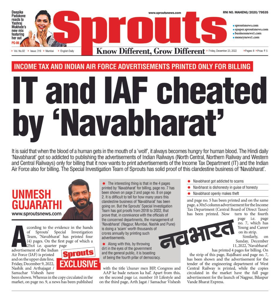 It is said that when the blood of a human gets in the mouth of a ‘wolf’, it always becomes hungry for human blood. The Hindi daily ‘Navabharat’ got so addicted to publishing the advertisements of Indian Railways (North Central, Northern Railway and Western and Central Railways) only for billing that it now wants to print advertisements of the Income Tax Department (IT) and the Indian Air Force also for billing. The Special Investigation Team of Sprouts has solid proof of this clandestine business of ‘Navabharat’.