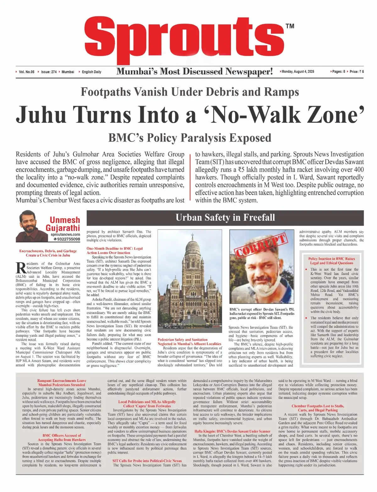 The Sprouts News Investigation Team (SIT) has demanded a comprehensive inquiry by the Maharashtra Lokayukta or Anti-Corruption Bureau into the alleged nexus between BMC officials, local politicians, and encroachers. Urban planning experts also argue that repeated violations of public spaces indicate systemic governance failure. Without strict accountability and transparent enforcement, Mumbai’s pedestrian infrastructure will continue to deteriorate. As citizens lose access to safe walkways, the broader implications on traffic safety, environmental hygiene, and urban equity become increasingly severe.