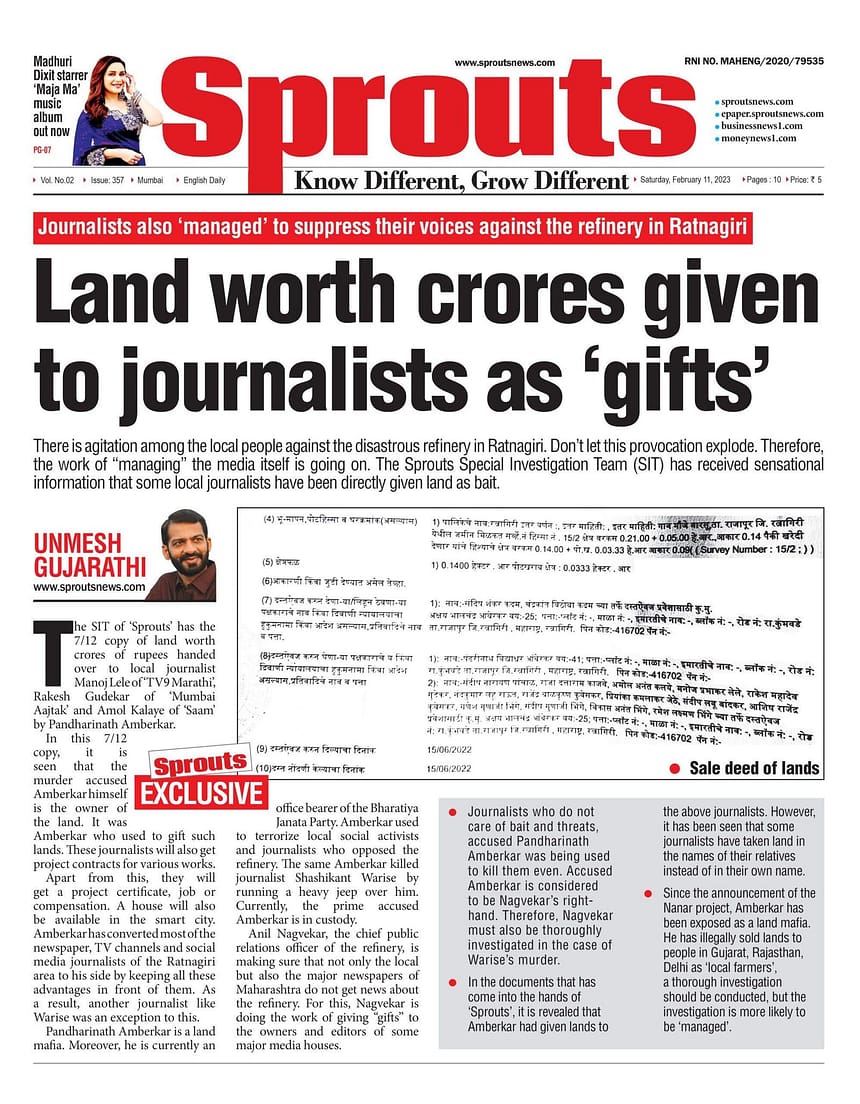 ‘स्प्राउट्स’ के हाथ में जो दस्तावेज आए हैं, उससे पता चलता है कि आंबेरकर ने उक्त पत्रकारों को जमीनें दी हैं. हालांकि, यह देखने में आया है कि कुछ पत्रकारों ने अपने नाम की जगह अपने रिश्तेदारों के नाम पर जमीन ली है. नाणार परियोजना (Nanar project) की घोषणा के बाद से ही आंबेरकर का भू-माफिया के रूप में पर्दाफाश हो गया है. उसने अवैध रूप से गुजरात, राजस्थान, दिल्ली में ‘स्थानीय किसानों’ के रूप में लोगों को जमीनें बेची हैं, इसकी गहन जांच की जानी चाहिए, लेकिन जांच के ‘मैनेज्ड’ होने की अधिक संभावना है.