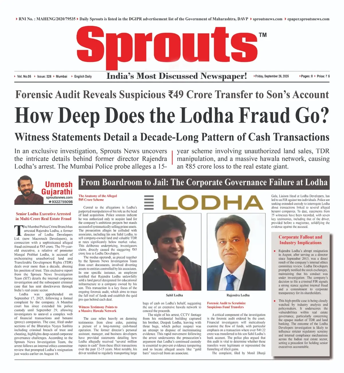 The Mumbai Police Crime Branch has arrested Rajendra Lodha, former director of Lodha Developers Ltd. (now Macrotech Developers), in a fraud probe involving unauthorized land sales, TDR manipulation, and a suspected hawala network. A forensic audit uncovered a suspicious ₹49 crore transfer to his son’s account and witness statements outlining a decade-long pattern of cash transactions. In an exclusive investigation, Sprouts News uncovers the intricate details behind former director Rajendra Lodha’s arrest. The Mumbai Police probe alleges a 15-year scheme involving unauthorized land sales, TDR manipulation, and a massive hawala network, causing an ₹85 crore loss to the real estate giant.