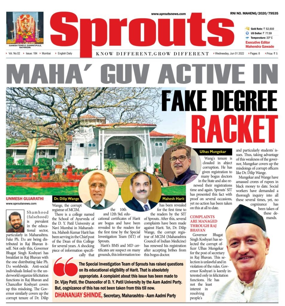 There is a college named the School of Ayurveda of the D. Y. Patil University at Navi Mumbai in Maharashtra. Mahesh Kumar Harit has been serving in the Chief post of the Dean of this College for several years. A shocking piece of information specifically that the 10th and 12th Std. educational certificates of Harit are bogus and have been revealed to the readers for the first time by the Special Investigation Team (SIT) of Sprouts.