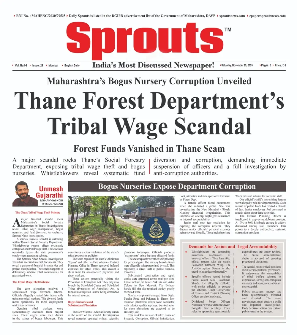 A major financial scandal rocks Maharashtra’s Social Forestry Department in Thane. Investigations reveal tribal wage manipulation, bogus nurseries, and fund diversion. An exclusive Sprouts News investigation.