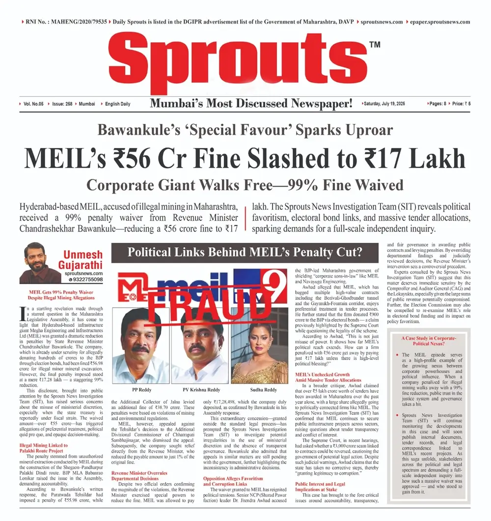 Hyderabad-based MEIL, accused of illegal mining in Maharashtra, received a 99% penalty waiver from Revenue Minister Chandrashekhar Bawankule—reducing a ₹56 crore fine to ₹17 lakh. The Sprouts News Investigation Team (SIT) reveals political favoritism, electoral bond links, and massive tender allocations, sparking demands for a full-scale independent inquiry.