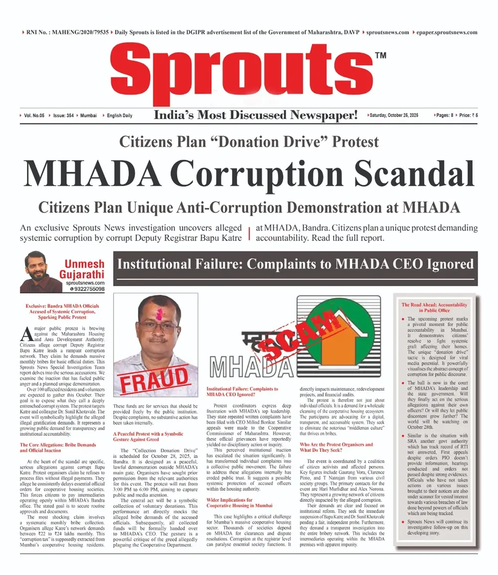 A major public protest is brewing against the Maharashtra Housing and Area Development Authority. Citizens allege corrupt Deputy Registrar Bapu Katre leads a rampant corruption network. They claim he demands massive monthly bribes for basic official duties. This Sprouts News Special Investigation Team report delves into the serious accusations. We examine the inaction that has fueled public anger and a planned unique demonstration.