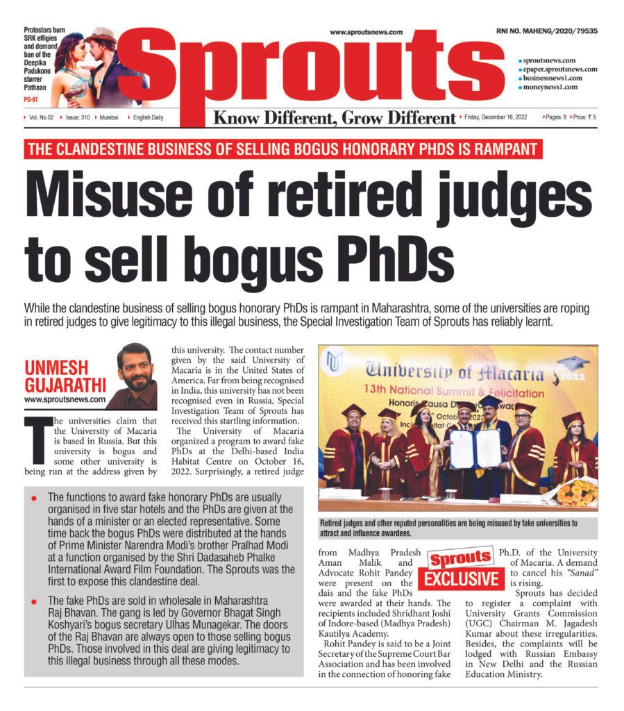 While the clandestine business of selling bogus honorary PhDs is rampant in Maharashtra, some of the universities are roping in retired judges to give legitimacy to this illegal business, the Special Investigation Team of Sprouts has reliably learnt.