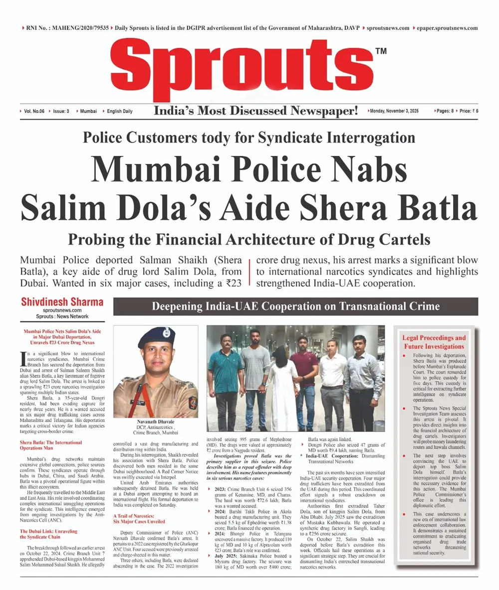 The Mumbai Crime Branch has arrested Salman Saleem Shaikh alias Shera Batla, a key aide of drug lord Salim Dola, following his deportation from Dubai. Batla, wanted in six major narcotics cases, was part of a ₹23 crore drug trafficking network spanning Maharashtra and Telangana. His capture marks a major breakthrough in the crackdown on international narcotics syndicates, strengthening India–UAE cooperation against cross-border organized crime.