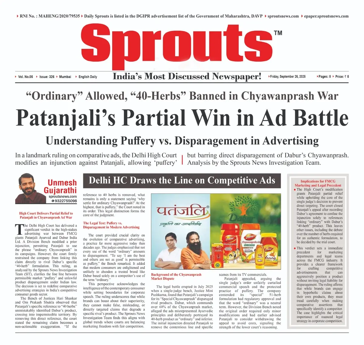 This ruling, as analyzed by the Sprouts News Investigation Team (SIT), clarifies the fine line between permissible market “puffery” and unlawful product disparagement under Indian law. The decision is set to redefine comparative advertising strategies in India’s competitive consumer goods sector.