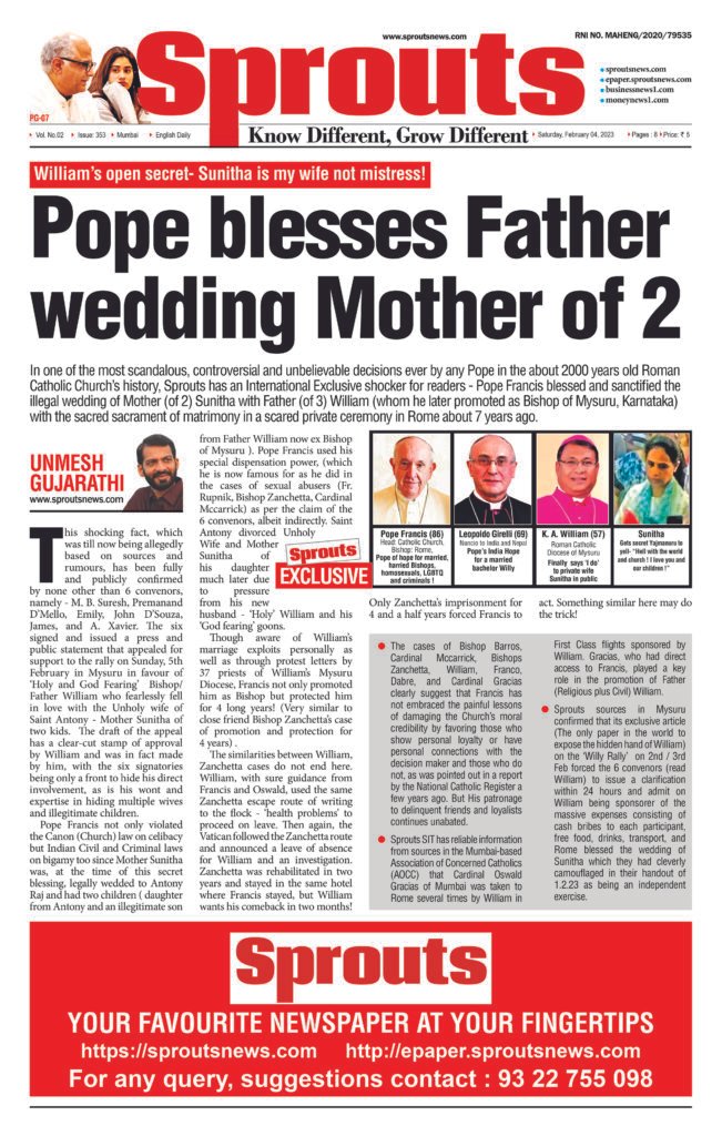 Sprouts sources in Mysuru confirmed that its exclusive article (The only paper in the world to expose the hidden hand of William) on the ‘Willy Rally’ on 2nd / 3rd Feb forced the 6 convenors (read William) to issue a clarification within 24 hours and admit on William being sponsorer of the massive expenses consisting of cash bribes to each participant, free food, drinks, transport, and Rome blessed the wedding of Sunitha which they had cleverly camouflaged in their handout of 1.2.23 as being an independent exercise.