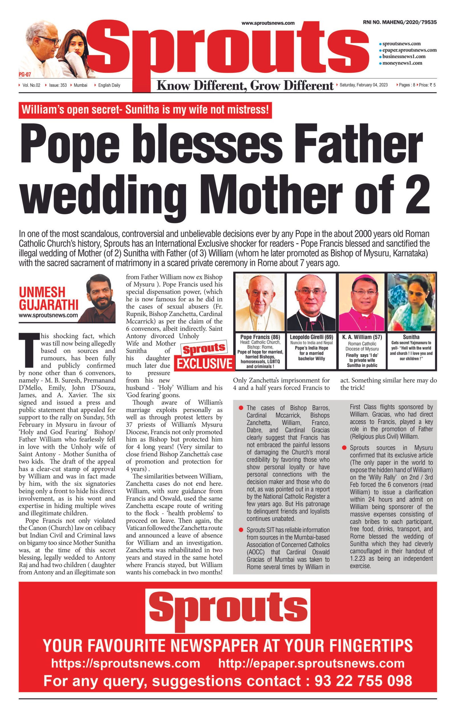 In one of the most scandalous, controversial and unbelievable decisions ever by any Pope in the about 2000 years old Roman Catholic Church’s history, Sprouts has an International Exclusive shocker for readers – Pope Francis blessed and sanctified the illegal wedding of Mother (of 2) Sunitha with Father (of 3) William (whom he later promoted as Bishop of Mysuru, Karnataka) with the sacred sacrament of matrimony in a scared private ceremony in Rome about 7 years ago.