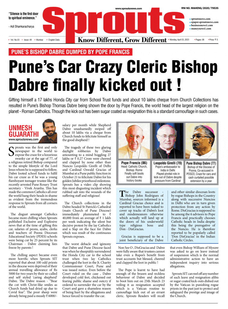 The Pope is learnt to have had enough of the brazen and reckless behaviour of Dabre and decided to boot him out on 25th March 23 veiling it as resignation accepted which is a Vatican routine to camouflage kick out of an errant cleric.