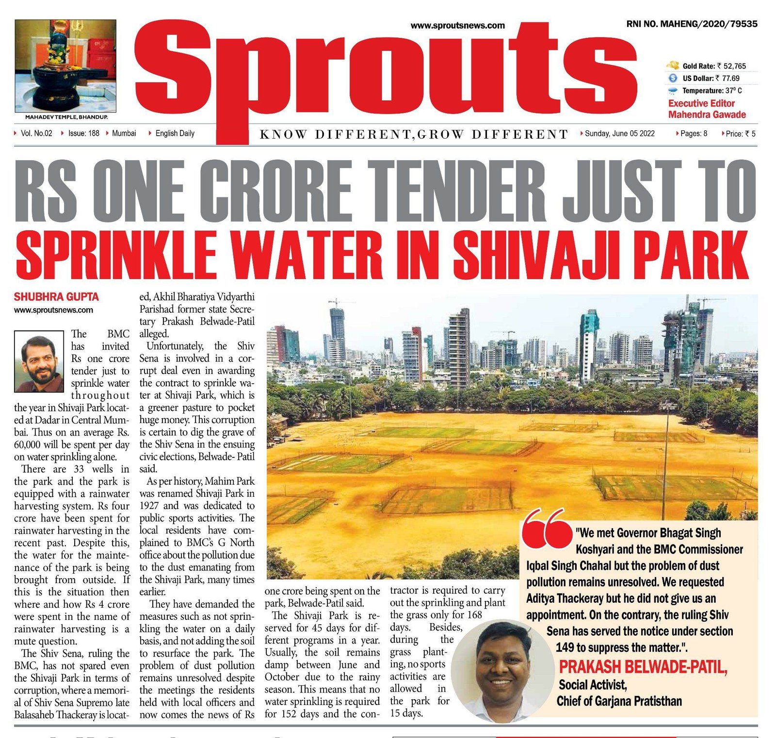 The BMC has invited Rs one crore tender just to sprinkle water throughout the year in Shivaji Park located at Dadar in Central Mumbai. Thus on an average Rs. 60,000 will be spent per day on water sprinkling alone.