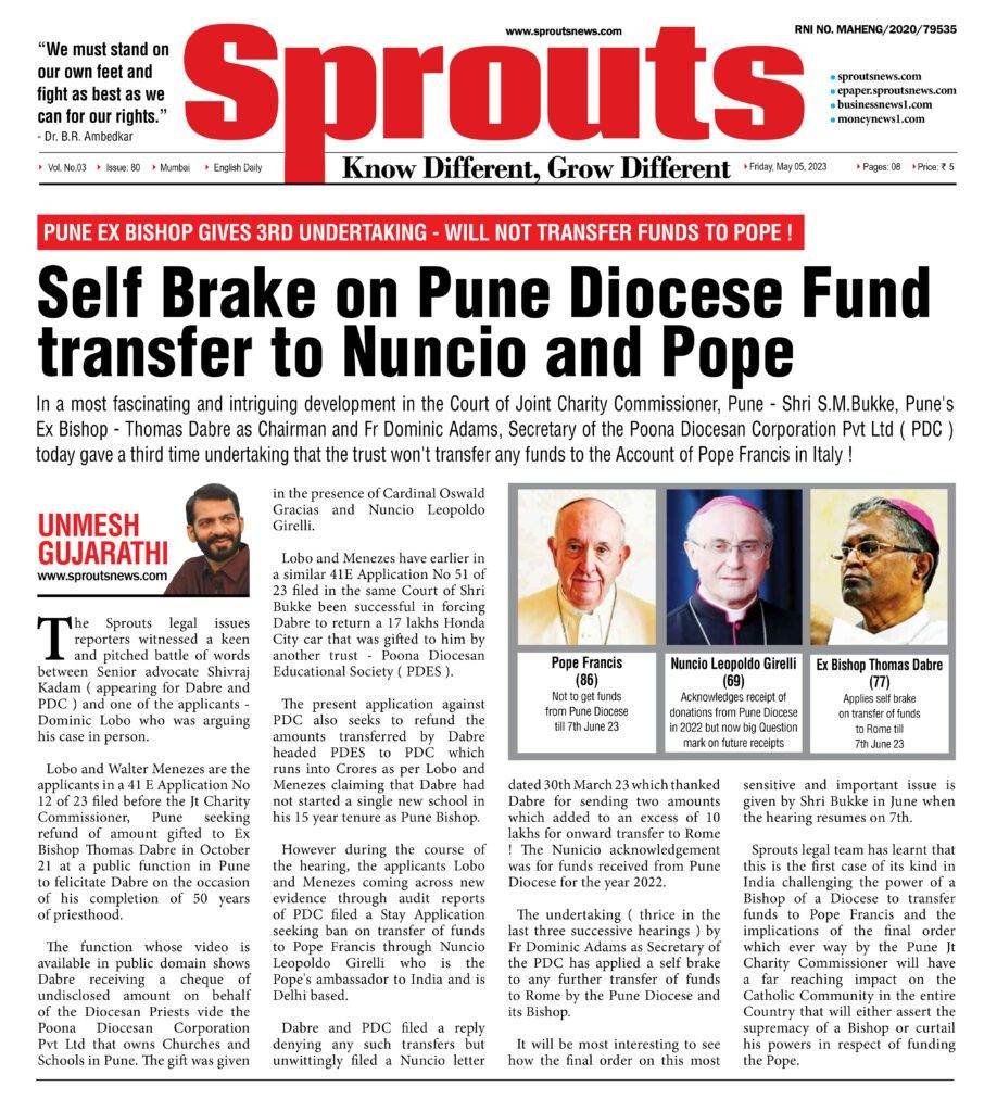 Sprouts legal team has learnt that this is the first case of its kind in India challenging the power of a Bishop of a Diocese to transfer funds to Pope Francis and the implications of the final order which ever way by the Pune Jt Charity Commissioner will have a far reaching impact on the Catholic Community in the entire Country that will either assert the supremacy of a Bishop or curtail his powers in respect of funding the Pope.