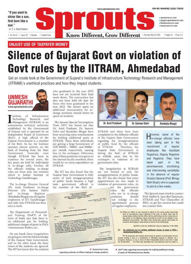 The Sprouts Special Investigation Team (SIT) has found out that Dr. Amit Prashant, Dr. Sameer Dalvi and Rambabu Bhagat have been receiving extra remuneration for holding additional posts at IITRAM.
